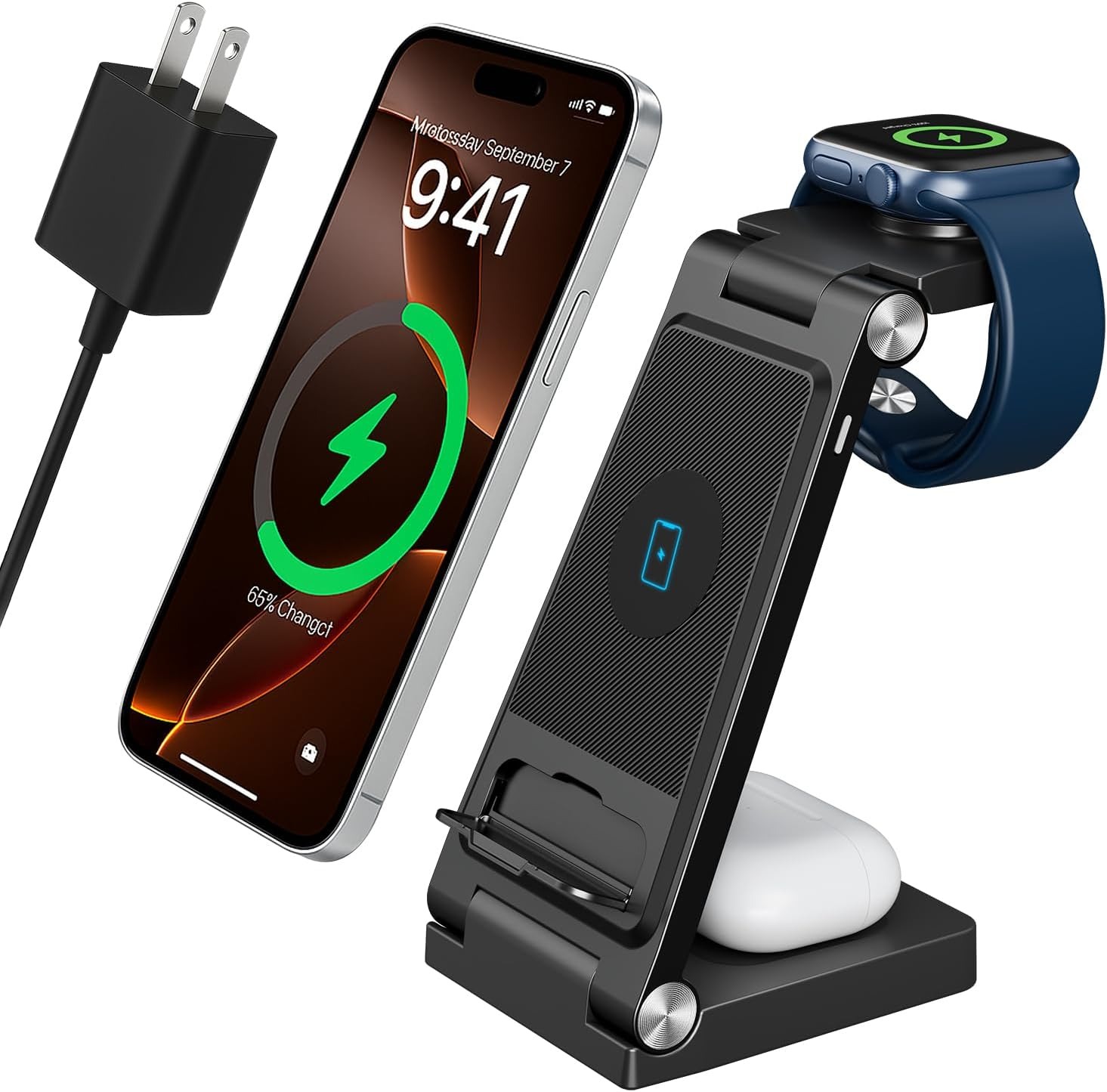 Foldable design ideal for travel or bedside useCharges iPhone, Apple Watch, and AirPods together